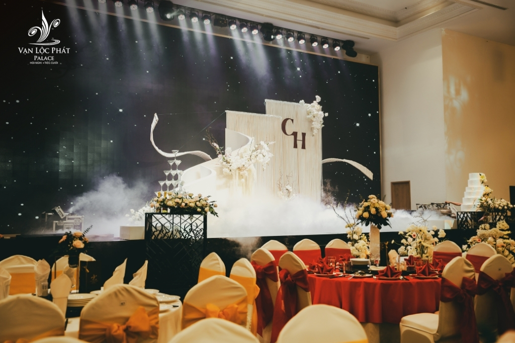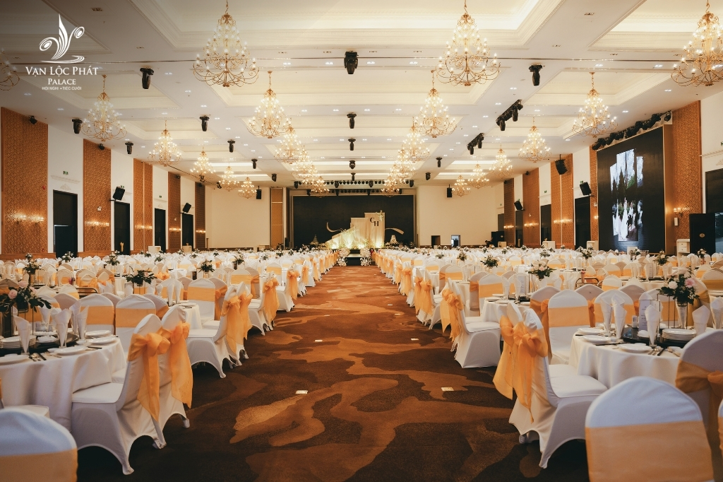 Vạn Lộc Phát Palace gây ấn tượng với trần cao đến 7m, tạo cảm giác mở rộng và lộng lẫy như bước vào cung điện. Ánh sáng được thiết kế hài hòa – vừa đủ lung linh cho khoảnh khắc thiêng liêng, vừa ấm áp cho bữa tiệc sum vầy. Hệ thống âm thanh – ánh sáng hiện đại, màn hình LED sắc nét cùng sân khấu rộng giúp mọi phong cách cưới – từ cổ điển đến hiện đại – đều được thể hiện hoàn hảo.