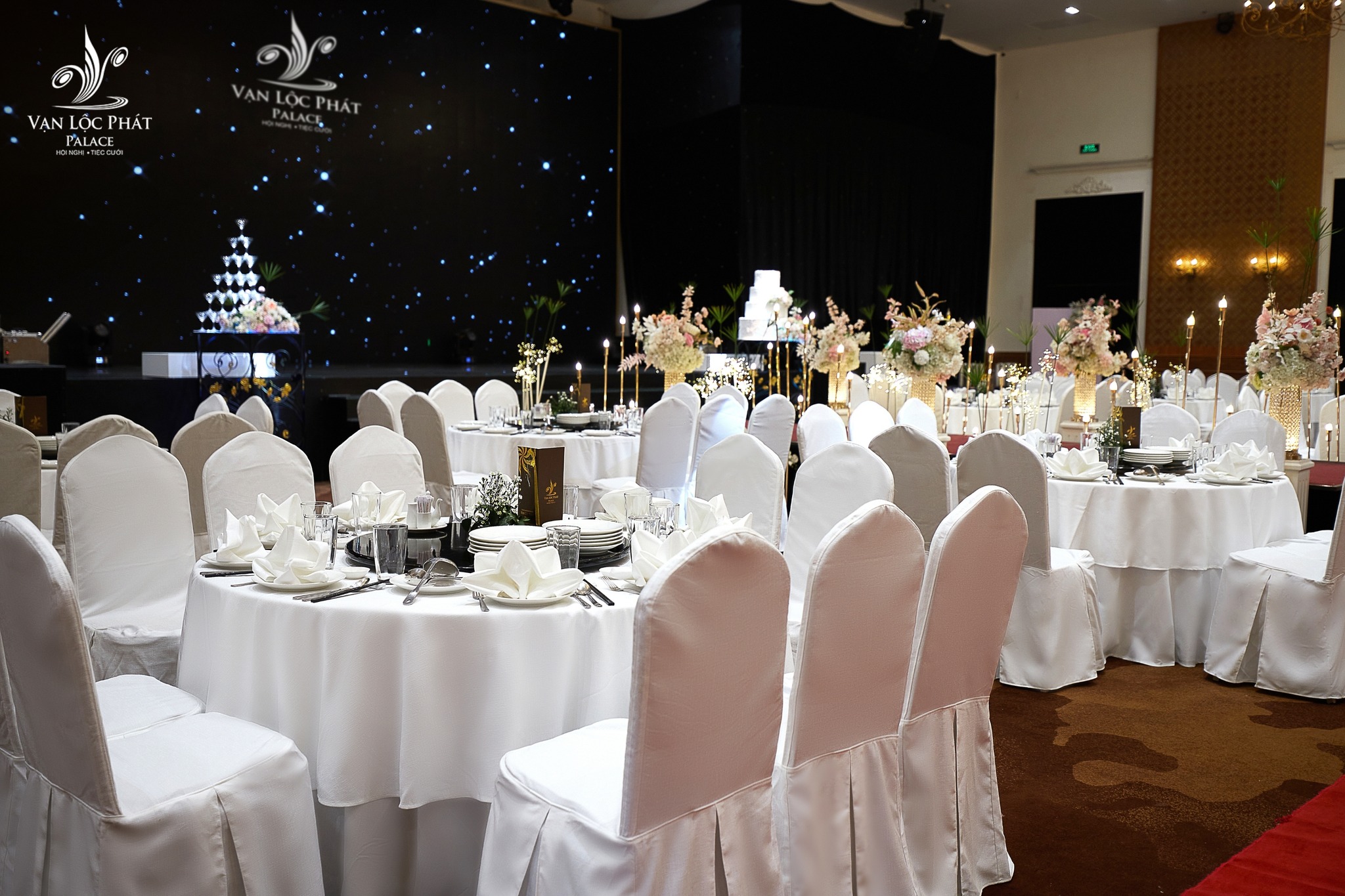 Tại Vạn Lộc Phát Palace, mỗi sảnh tiệc có thể được biến hóa theo nhiều concept khác nhau để phù hợp với sở thích và cá tính của đôi uyên ương. Ví dụ, với các cặp đôi yêu thích vibe nhẹ nhàng và thanh lịch, sắc trắng tinh khiết kết hợp ánh sáng vàng nhẹ và hoa trang nhã sẽ tạo nên một không gian vừa tinh tế vừa ấm cúng.